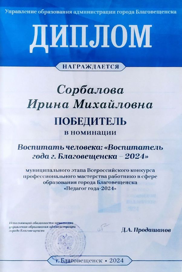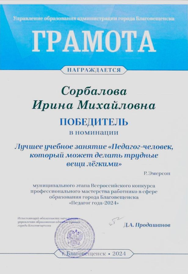 Почетная грамота управления образования администрации горда Благовещенска, 2013г.